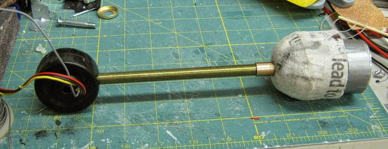 I drilled a hole and tapped into to the caster itself and drilled another hole at a 90 degree angle and threaded wire through to the eye. I originally thought that if I was able to do this then I could sort of unscrew the eye stalk for easier transportation. To be able to unscrew the stalk I need to be able to disconnect the wires but the act of unscrewing the tube twists the wires.